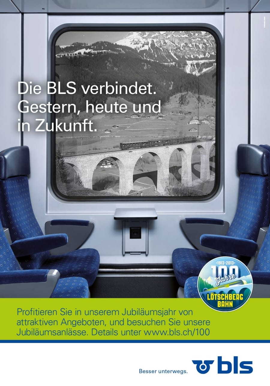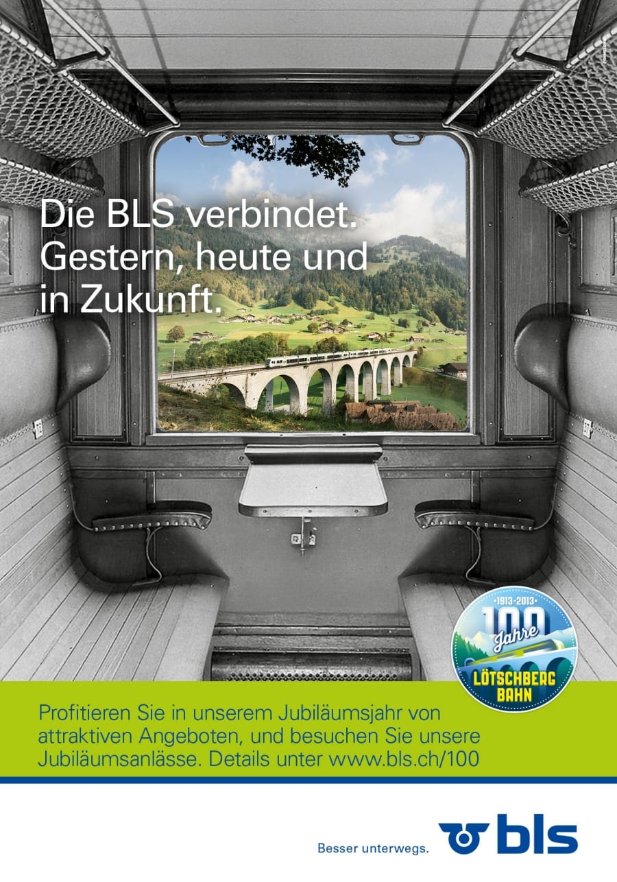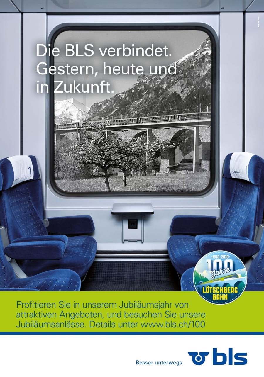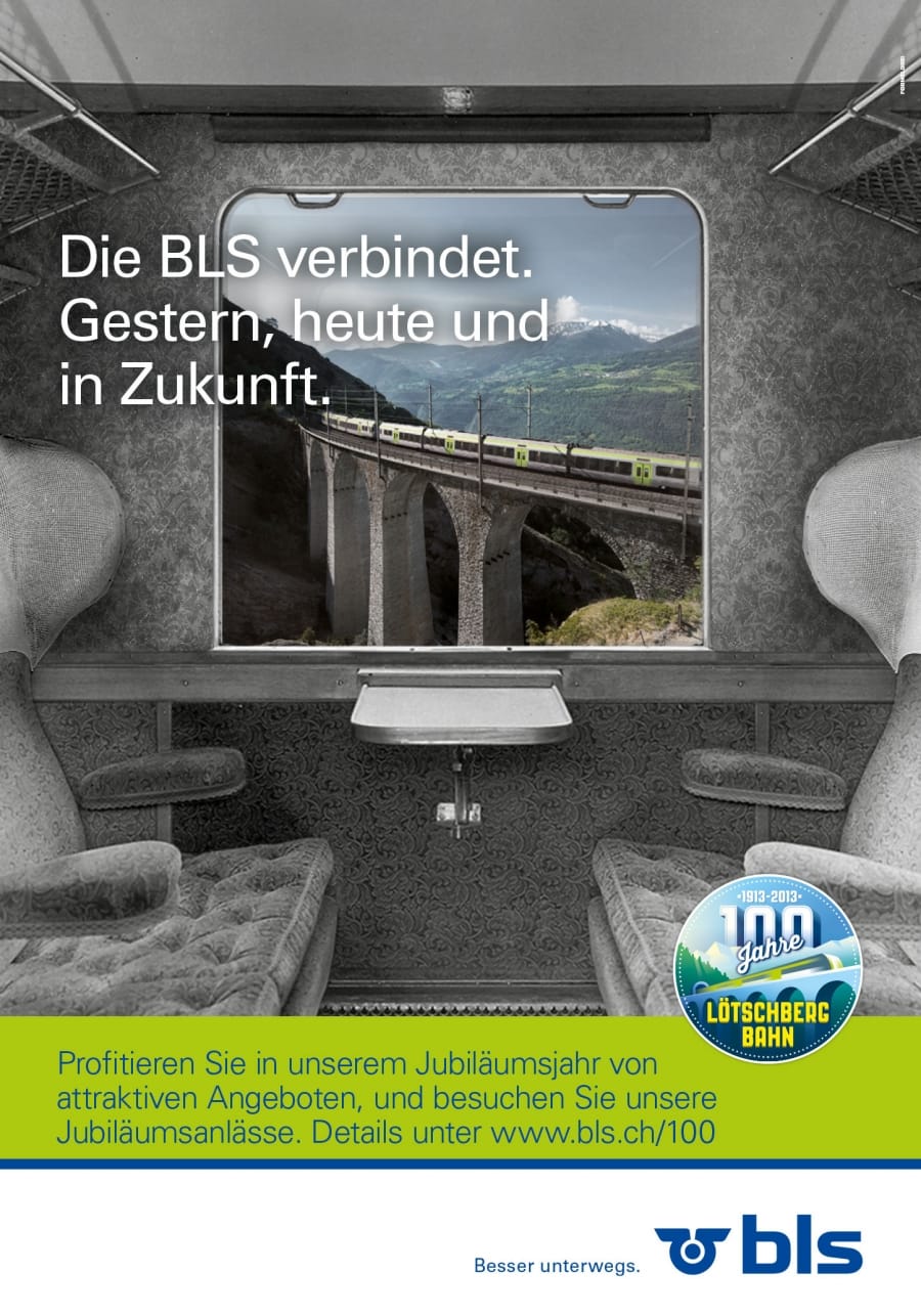 2013 feiert die BLS AG das 100-jährige Bestehen der Lötschbergbahn. Der Lötschberg, das „L“ der BLS, wurde 1911 durchstochen, und nur zwei Jahre später konnte die Bahnlinie vom Berner Oberland ins Wallis eingeweiht werden. Die technologische Höchstleistung von damals – seitlich betrug die Abweichung beim Aufeinandertreffen der Tunnelbohrer nur 247 und in der Höhe gar nur 102 Millimeter – steht bis heute für die BLS AG als Verbinderin zwischen Nord und Süd. Im Jubiläumsjahr spielt die Lötschbergbahn bei der BLS AG eine wichtige Rolle als strategische Kommunikationsplattform ein. Ein eigenes Jubiläumslogo wird viele Massnahmen schmücken und zahlreiche Feste südlich und nördlich des Bergs werden die historische Bedeutung der Alpentransversale erlebbar machen.