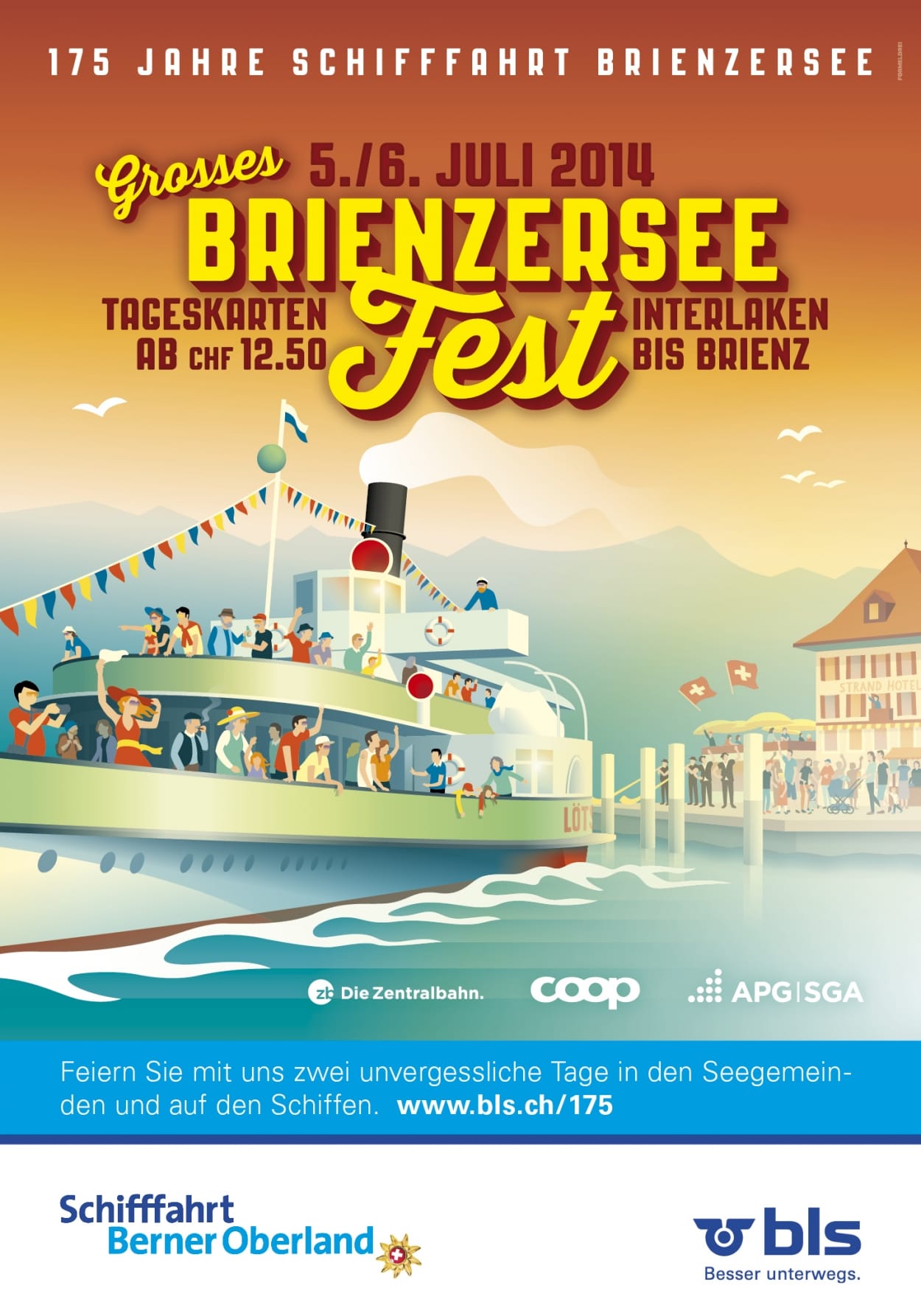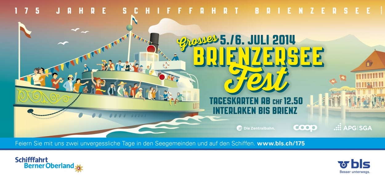 Nach dem 100-Jährigen der Lötschbergbahn letztes Jahr feiert die BLS AG 2014 gleich noch einmal: Das 175. der Schifffahrt Brienzersee und das 100. des Dampfschiffs Lötschberg. Alle sind eingeladen zum grossen Brienzerseefest am 5. und 6. Juli 2014, in vielen Seegemeinden und auf den Schiffen. Formeldrei macht Laune auf einen unvergesslichen Seetag - mit einer Illustration im Stil klassischer Tourismuswerbung, auf Plakaten, in Inseraten und den Verkehrsmitteln der BLS.