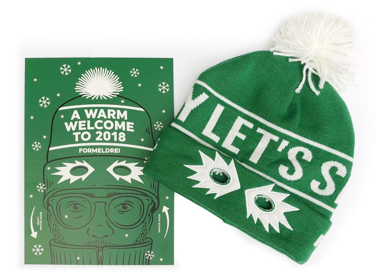 2018 kann kommen und darf ruhig auch etwas kühl beginnen. Das aktuelle Gadget aus der Formeldrei-Ideenschneiderei hält den Kopf warm und sorgt für hinreichend Durchblick auf die kommenden Projekte. Starten sie gut behütet im Januar!