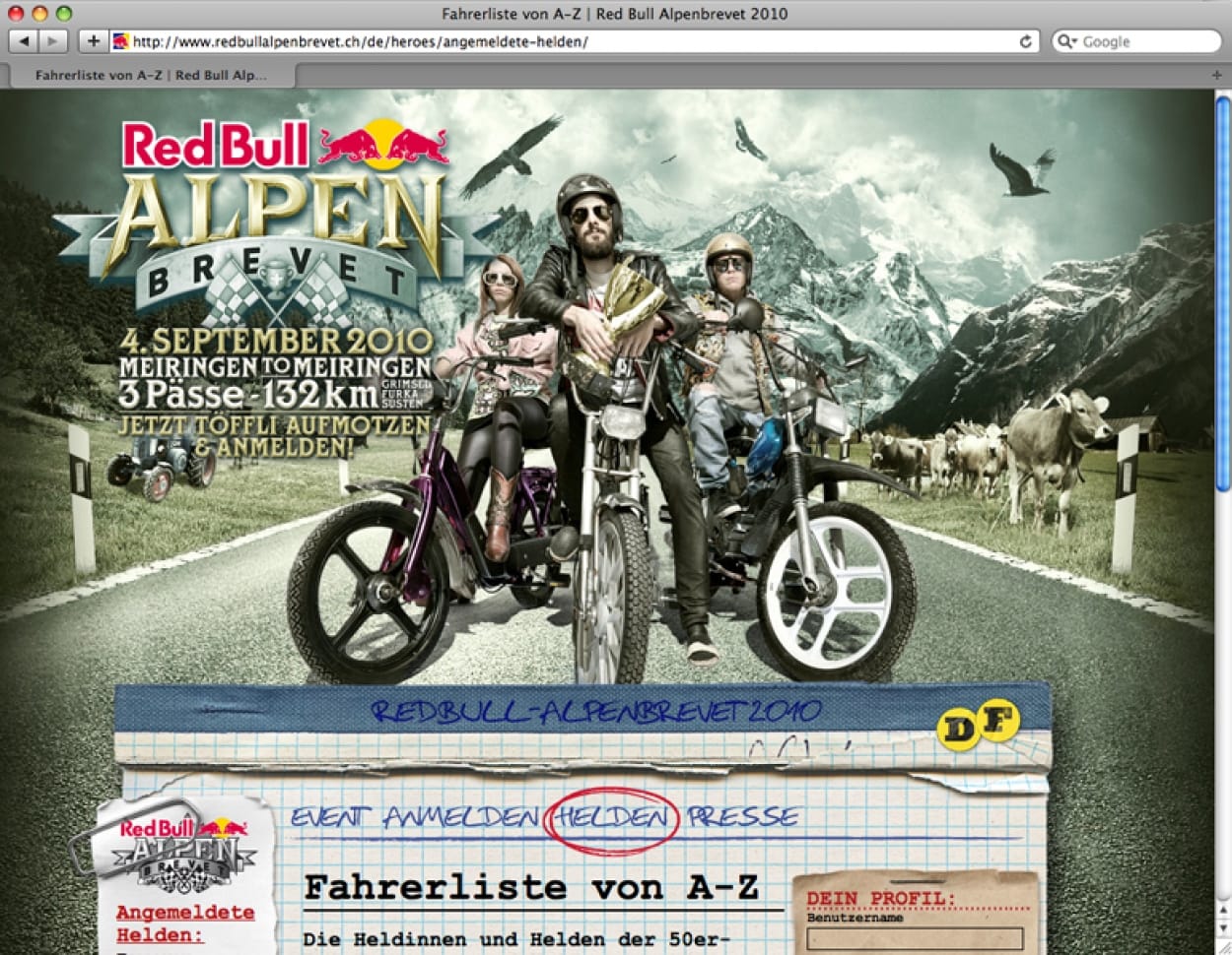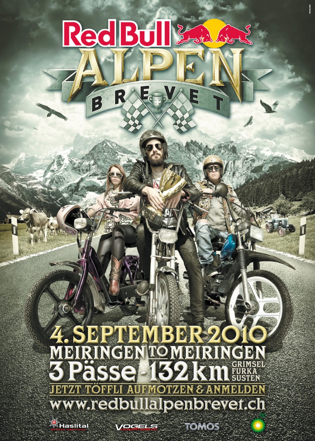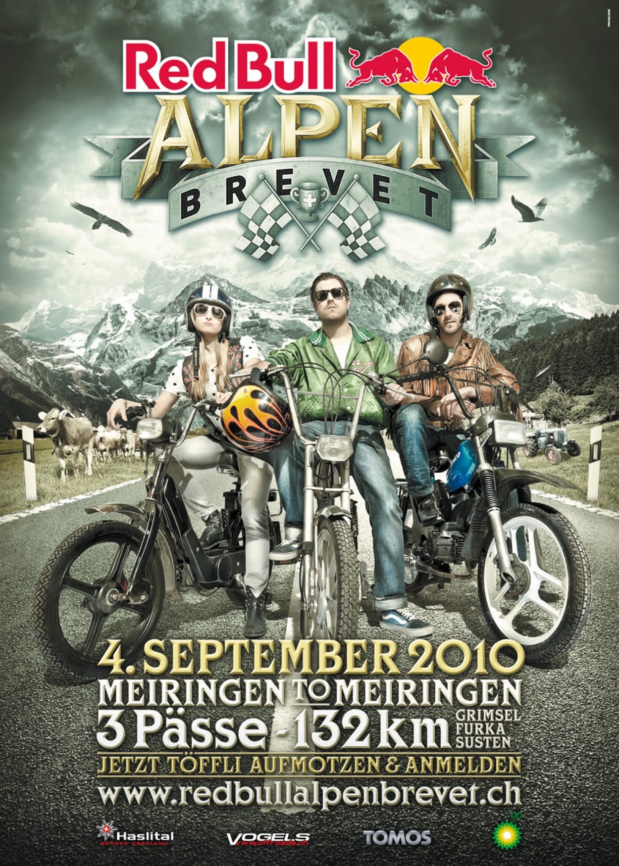 Da geraten 2-Takt-Fans komplett aus dem Häuschen. Das Red Bull Alpenbrevet führt junge und sich jung fühlende Töfflibuebe und -meitli von Meiringen über Grimsel, Furka, Susten und zurück. 132 km Hobeln im Pulk! Von F3 stammt das Kommunikationsdesign für den typischen Red Bull-Event, inklusive Print-Material, Anzeigen und die mit Facebook verlinkte Website, über die sich in kürzester Zeit über 300 Helden angemeldet haben. Zu gewinnen gibts – was sonst? – ein schönes Töffli und natürlich reichlich Sozialprestige in der wachsenden Fangemeinde.