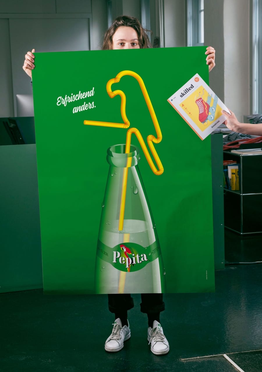 Unter dem Motto «Was wäre wenn?» suchte die Mineralquelle Eptingen AG kreative Köpfe für ein Pepita-Plakat – zum 100-jährigen Geburtstag von Herbert Leupin, als Hommage an den bekannten Schweizer Werbekünstler, der auch den Pepita-Papagei entwarf. Und Audrey holt sich die Lorbeeren. Wir sind mächtig stolz. Ihre Siegerarbeit wird in der Ausstellung «Happy Birthday dear Leupin» in der Schule für Gestaltung in Basel hängen sowie als Plakat im Sommer 2017 in der ganzen Schweiz zu sehen sein. Ein nicht zu verachtendes Preisgeld gibts obendrauf.