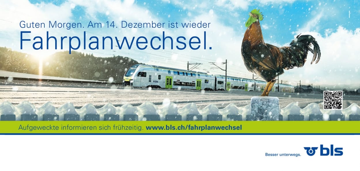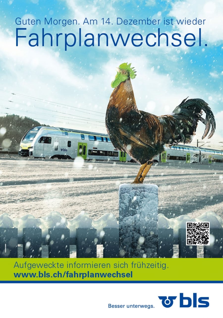 Ende Jahr wird immer schweizweit ein neuer Fahrplan eingeführt. Die BLS AG kündigt die Umstellung jeweils mit einem prächtigen Güggel an. Auch am 14. Dezember 2014 soll niemand zu spät oder zu früh aus den Federn, sondern genau rechtzeitig für den richtigen Zug, der wie gewohnt pünktlich zur Arbeit bringt.