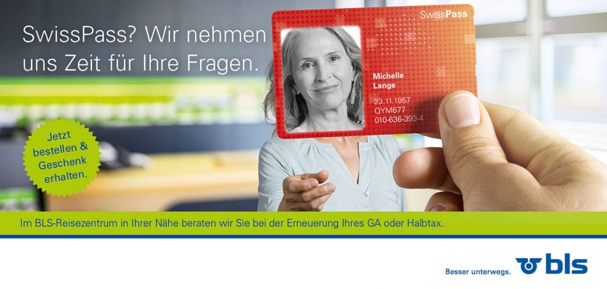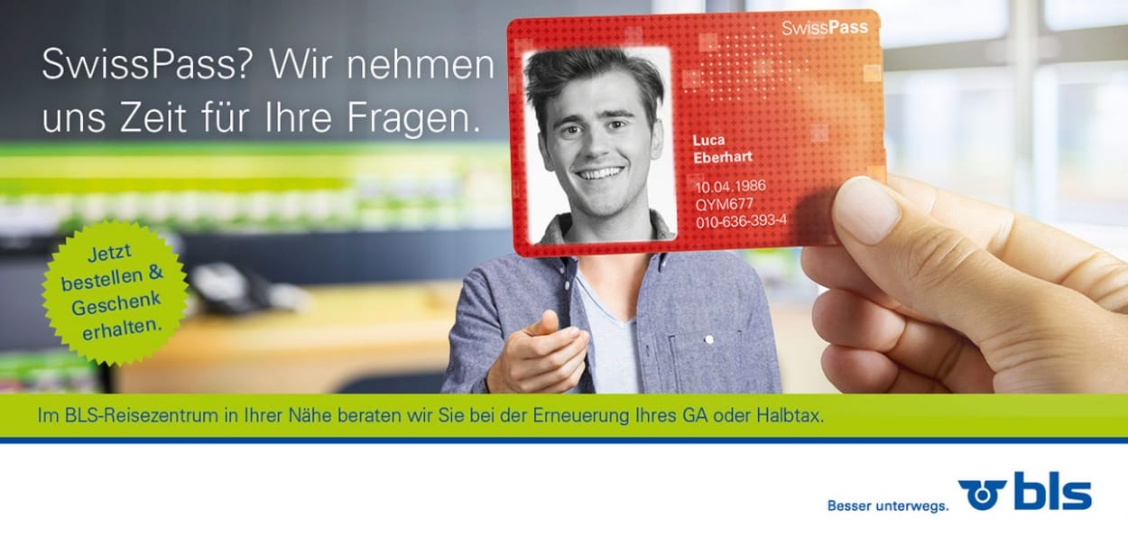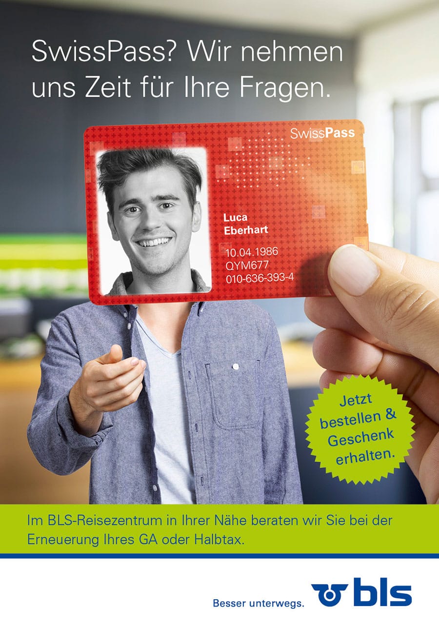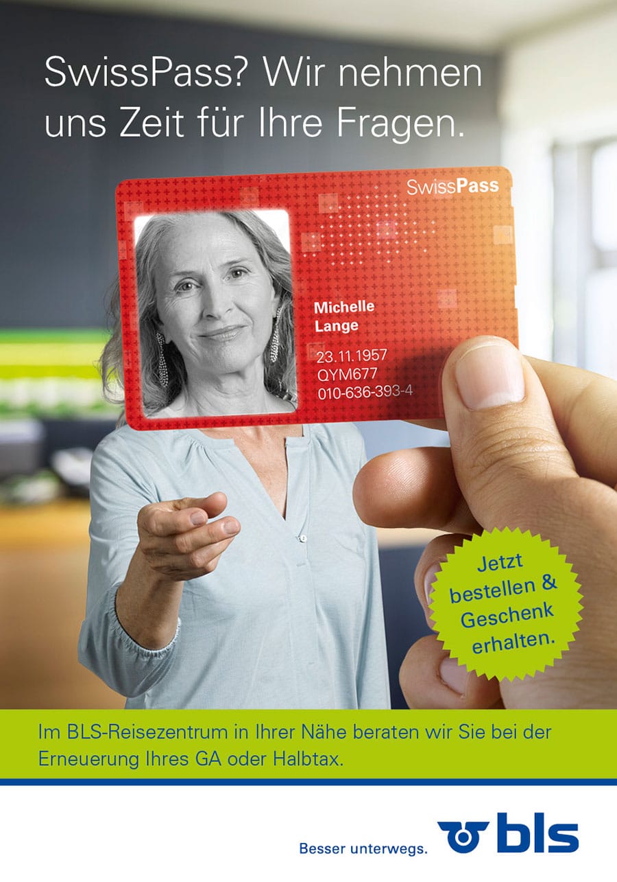 Wer gerne klare Antworten auf seine Fragen zum SwissPass haben möchte, ist in den rund 30 BLS Reisezentren und Verkaufsstellen am besten beraten. Diese Nähe zum Kunden inszeniert Formeldrei gleich im Kampagnen-Visual – mit dem Kunden-Passfoto direkt auf dem SwissPass.
