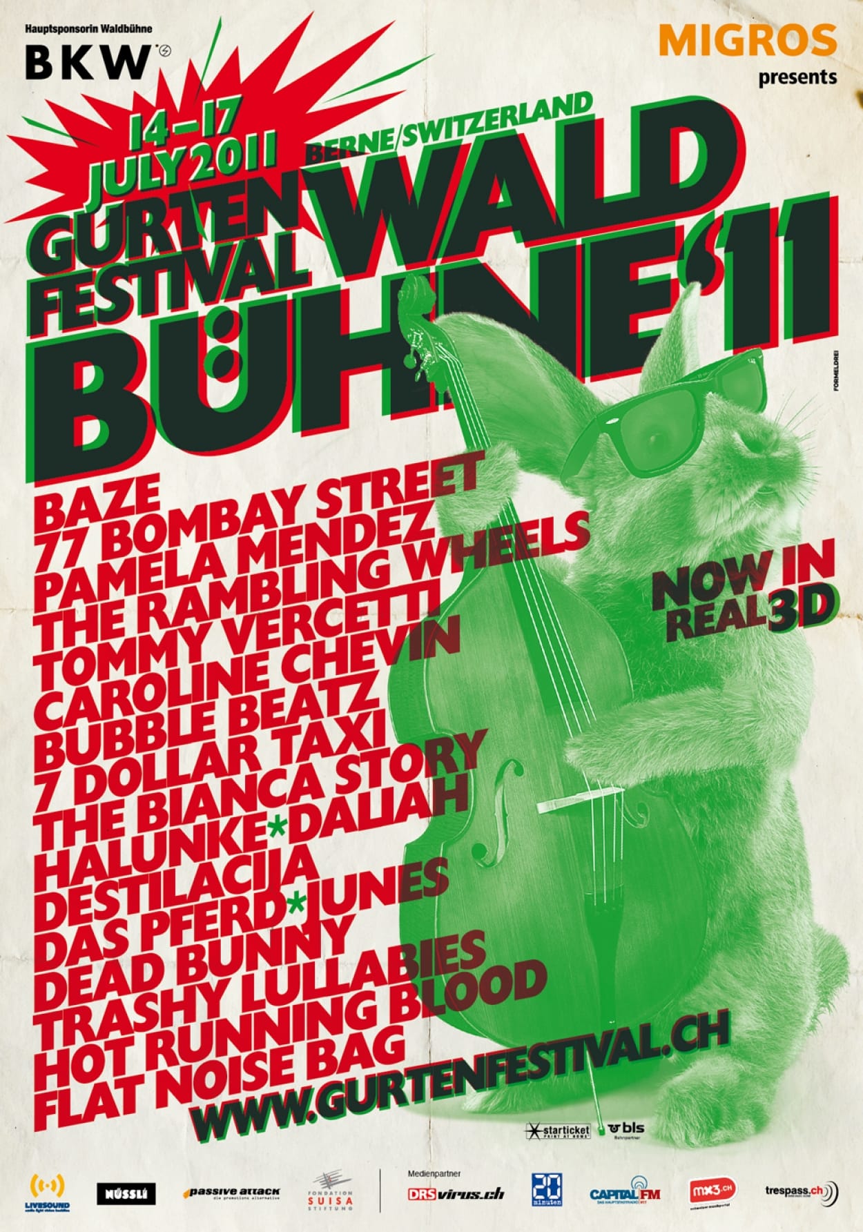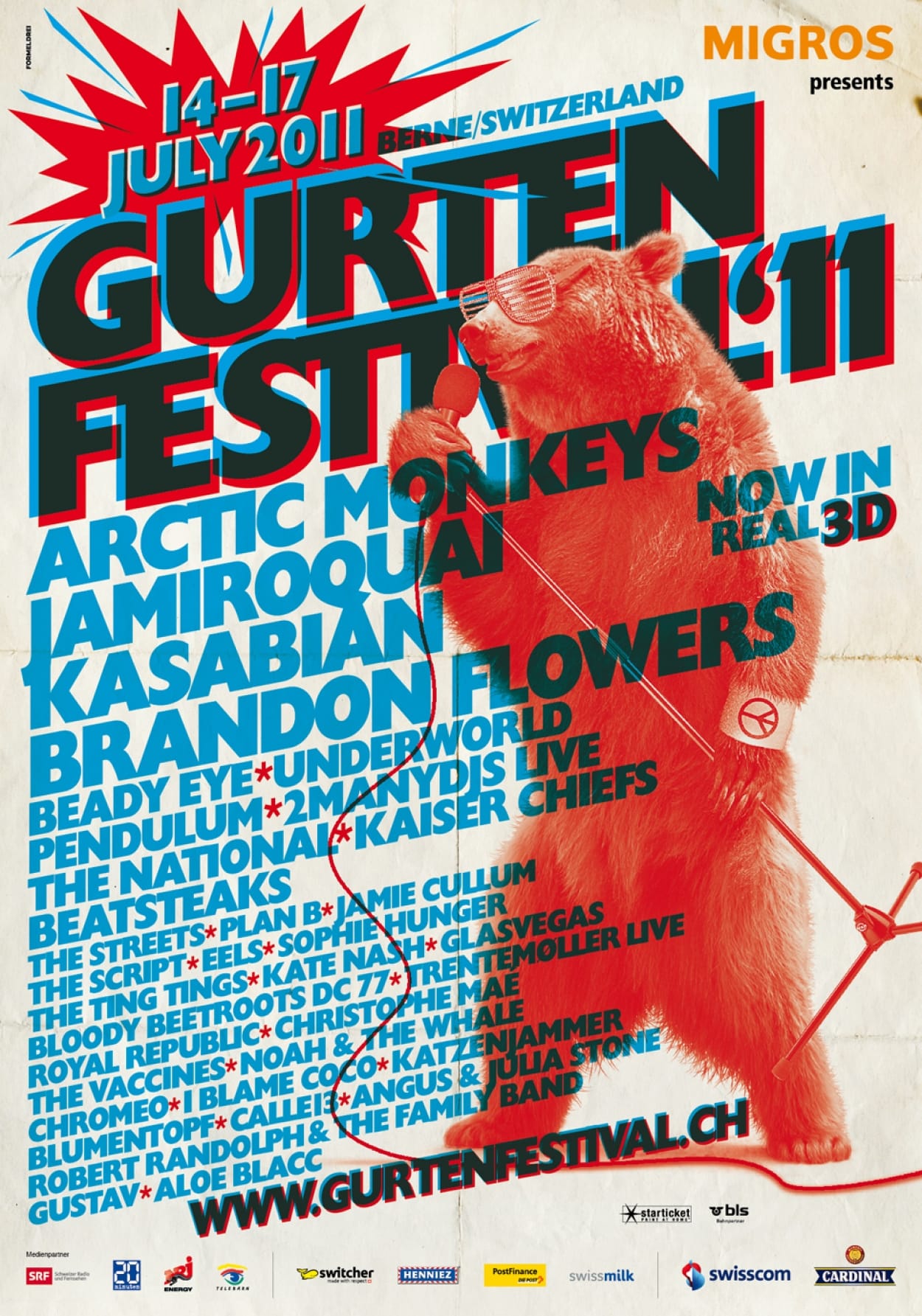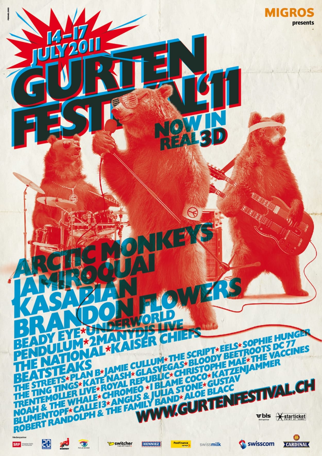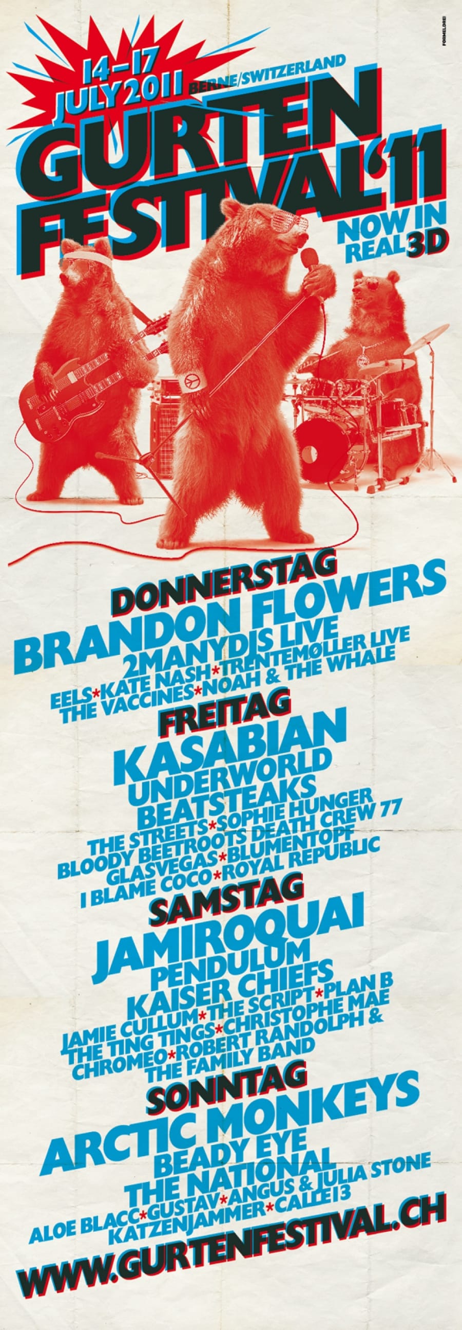 Brandon Flowers, Kasabian, Underworld, Jamiroquai oder die Arctic Monkeys – die Headliner des Festivalklassikers auf dem Hausberg der Hauptstadt sind wieder einmal bärenstark. Und weil das sympathische Tier aus Berns Wappen überhaupt ganz wunderbar ins Gesamtbild passt, kann man es gut für das Gurtenfestival 2011 werben lassen. Inszeniert werden die Festival-Bären als Band und zwar im 3D-Stil, nur dass das einem gedruckt nichts nützt. Für ein echtes 3D-Erlebnis muss man vom 14.–17. Juli 2011 den Weg auf den Gurten schon selber unter die Füsse nehmen. Realisiert wurden eine Website, Plakate, Inserate, Flyers, ein Booklet und vieles mehr.