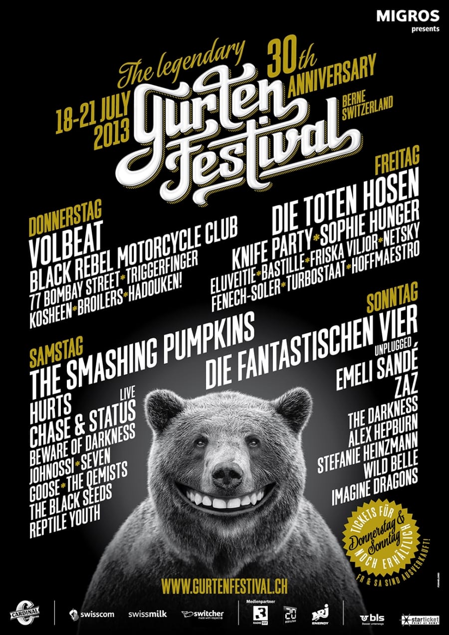 Die Hosen, Fanta Vier, Smashing Pumpkins, Volbeat sowie einige weitere einzigartige Top Acts des ganzen Schweizer Festivalsommers: Das grandiose Line-up des 30. Gurtenfestivals zaubert so manchem Openair-Fan ein richtig breites Lachen ins Gesicht, auch wenn der Güsche heuer etwa so schnell ausverkauft war wie warme Semmeln über die Theke gehen. Und man versteht, dass dem Bären, dem Haus-Tier auf dem Hausberg, das breite Grinsen gar nicht mehr zu vergehen scheint.