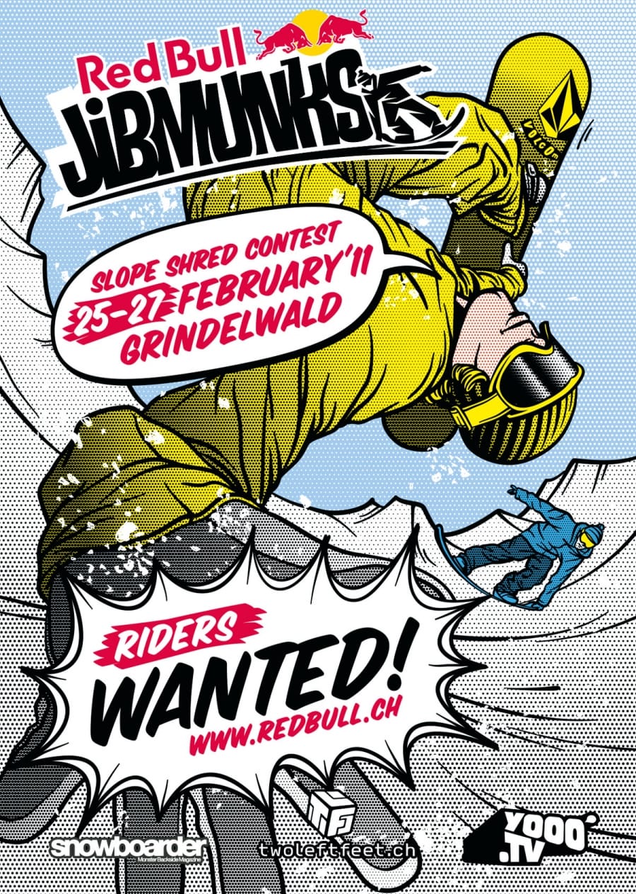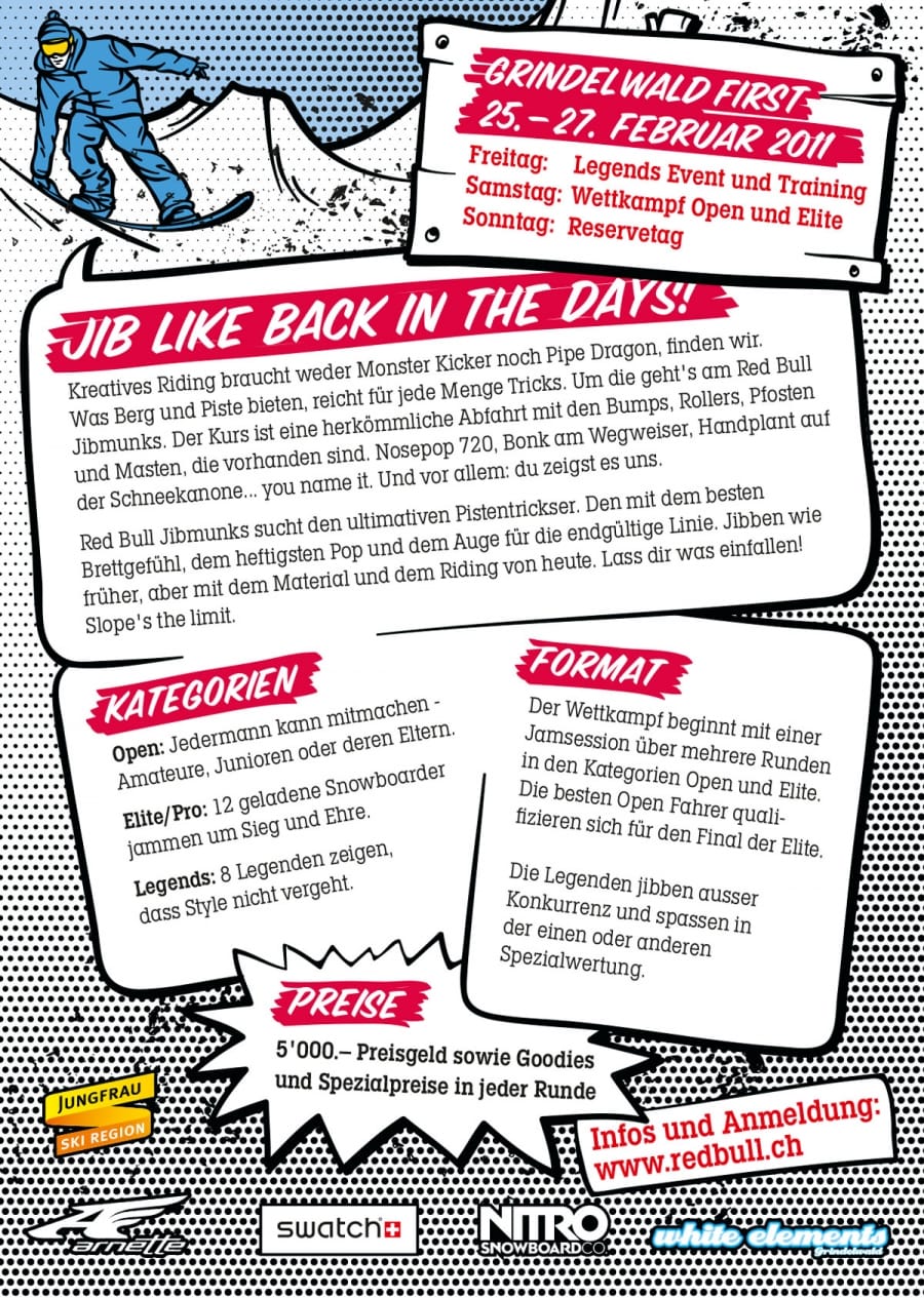 Vier Kategorien, Legends, Pros, Rookies, Girls und Opens, darunter auch Weltmeister und Olympiasieger vergnügen sich auf einer leicht aufgepeppten Piste mit Tricks und Sprüngen jenseits der Contest-Routine. Unser Jib bzw. unser Job: der passende Style für die on- und offline-Kommunikation und auch das Logo.