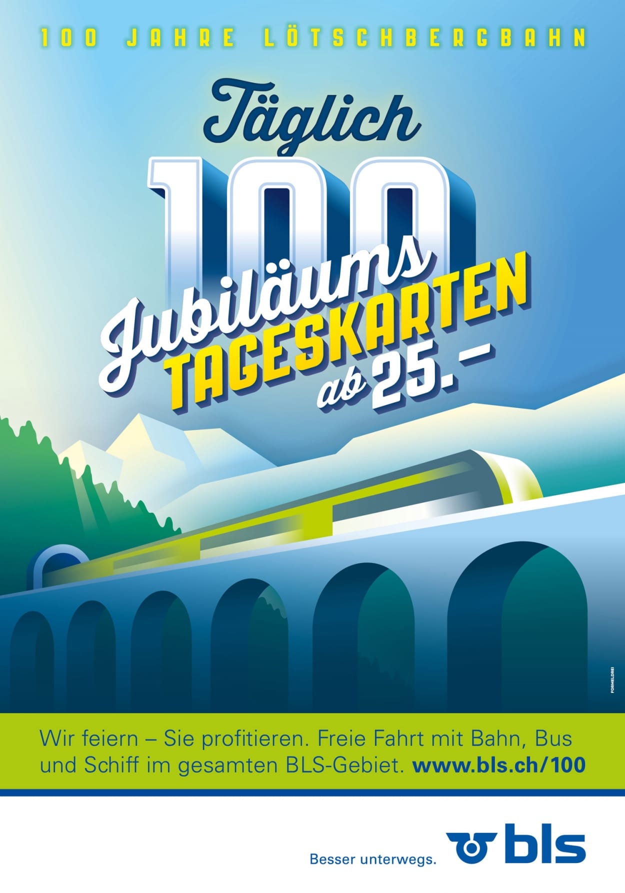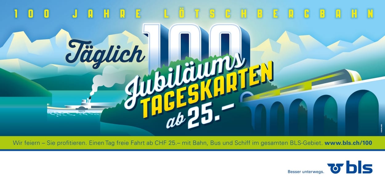 2013 feiert die BLS AG „100 Jahre Lötschbergbahn“ – mit dem Jubiläums-Visual von Formeldrei, das alle Fahrzeuge und viele Bahnhöfe schmückt, mit zwei grossen Volksfesten im Sommer, an der Nord- und an der Südrampe des Lötschbergtunnels und neu auch mit einem speziellen Ausflugsticket zum 100-jährigen Bestehen. „Wir feiern – Sie profitieren“ lautet der Slogan zur ersten BLS-eigenen Tageskarte, welche die Kunden zur freien Fahrt mit Bahn, Bus und Schiff auf dem ganzen BLS-Streckennetz berechtigt – und dieses ist weit, es führt durch die halbe Schweiz, von Fribourg, Neuchâtel und Biel über Solothurn und Langenthal bis nach Luzern und im Süden nach Brig. Damit erschliesst die neue BLS-Jubiläumstageskarte über Bern und Thun das Berner Oberland mit seinen Seen und Bergen als einzigartiges Ziel für Ausflüge mit der ganzen Familie. Speziell am Angebot ist: Die günstigste Tageskarte ab CHF 25.-- ist auf 100 Stück pro Tag limitiert und muss mindestens fünf Tage vor dem Reisedatum gekauft werden. Dadurch soll der Vorverkauf stimuliert werden und die Wetter Abhängigkeit verringert werden.