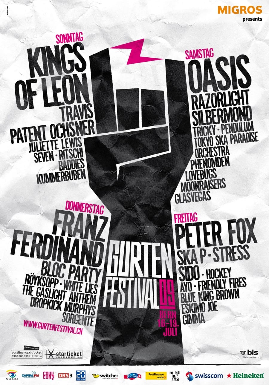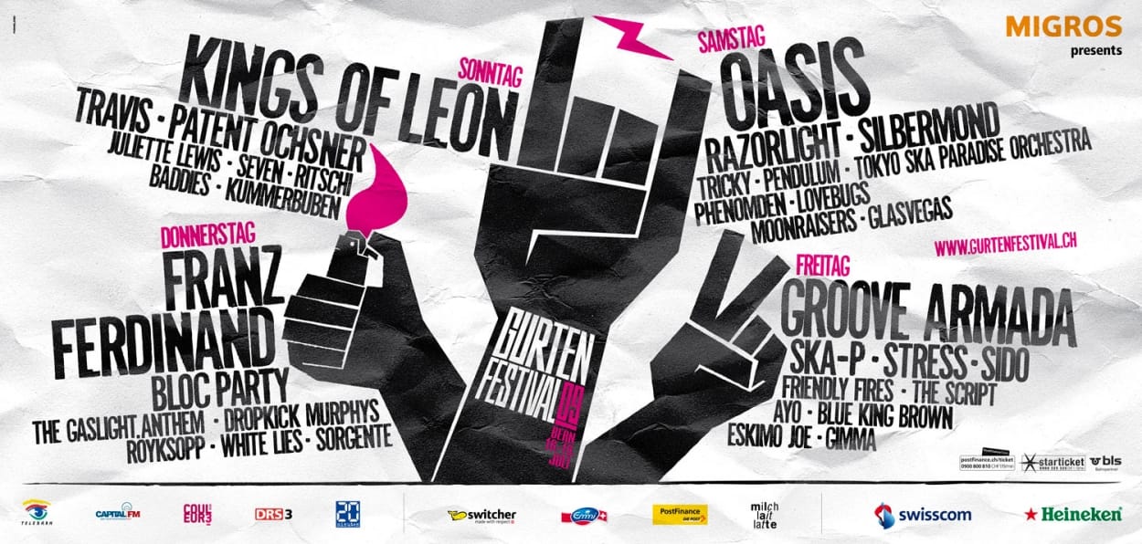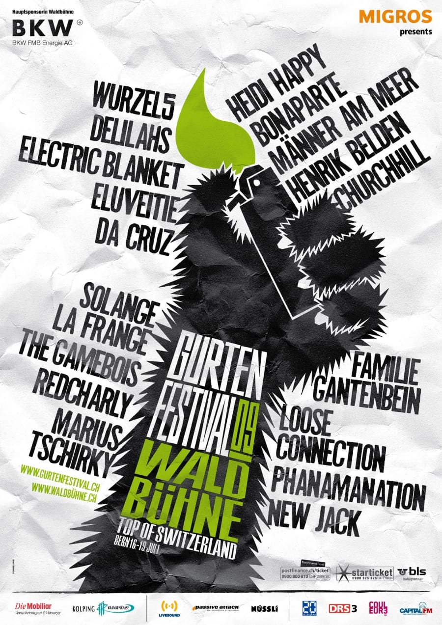 Auch in diesem Jahr kommt der Auftritt des Gurtenfestivals von Formeldrei. Das musikalische Hausberg-Gipfeltreffen von Stars wie Kings of Leon, Oasis, Franz Ferdinand Travis und vielen mehr illustrieren die Berner mit Händen in typischer Festivalpose. Das Waldbühne-Programm mit dem Besten aus heimischen Übungskellern erhält auch heuer ein eigenes Visual – typisch Bern – mit einer Bärenklaue. Häng ufe!