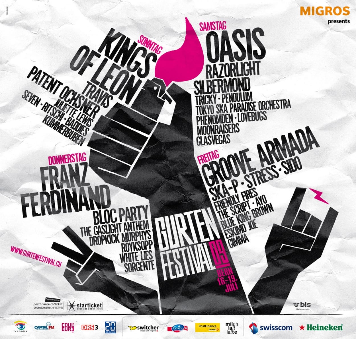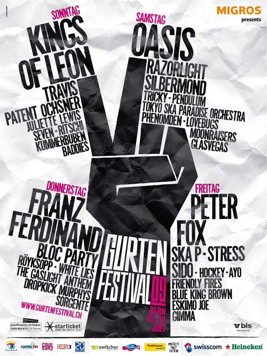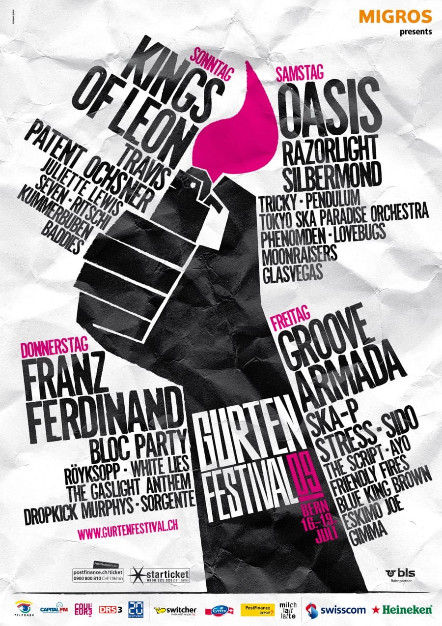 Auch in diesem Jahr kommt der Auftritt des Gurtenfestivals von Formeldrei. Das musikalische Hausberg-Gipfeltreffen von Stars wie Kings of Leon, Oasis, Franz Ferdinand Travis und vielen mehr illustrieren die Berner mit Händen in typischer Festivalpose. Das Waldbühne-Programm mit dem Besten aus heimischen Übungskellern erhält auch heuer ein eigenes Visual – typisch Bern – mit einer Bärenklaue. Häng ufe!