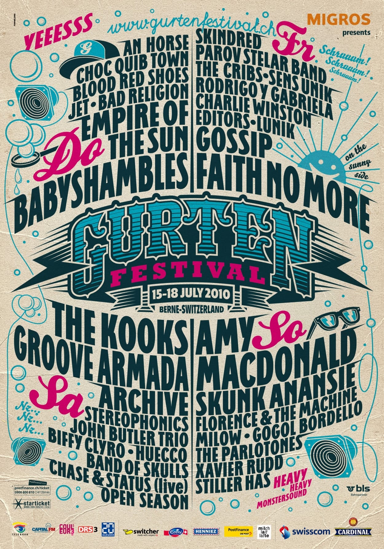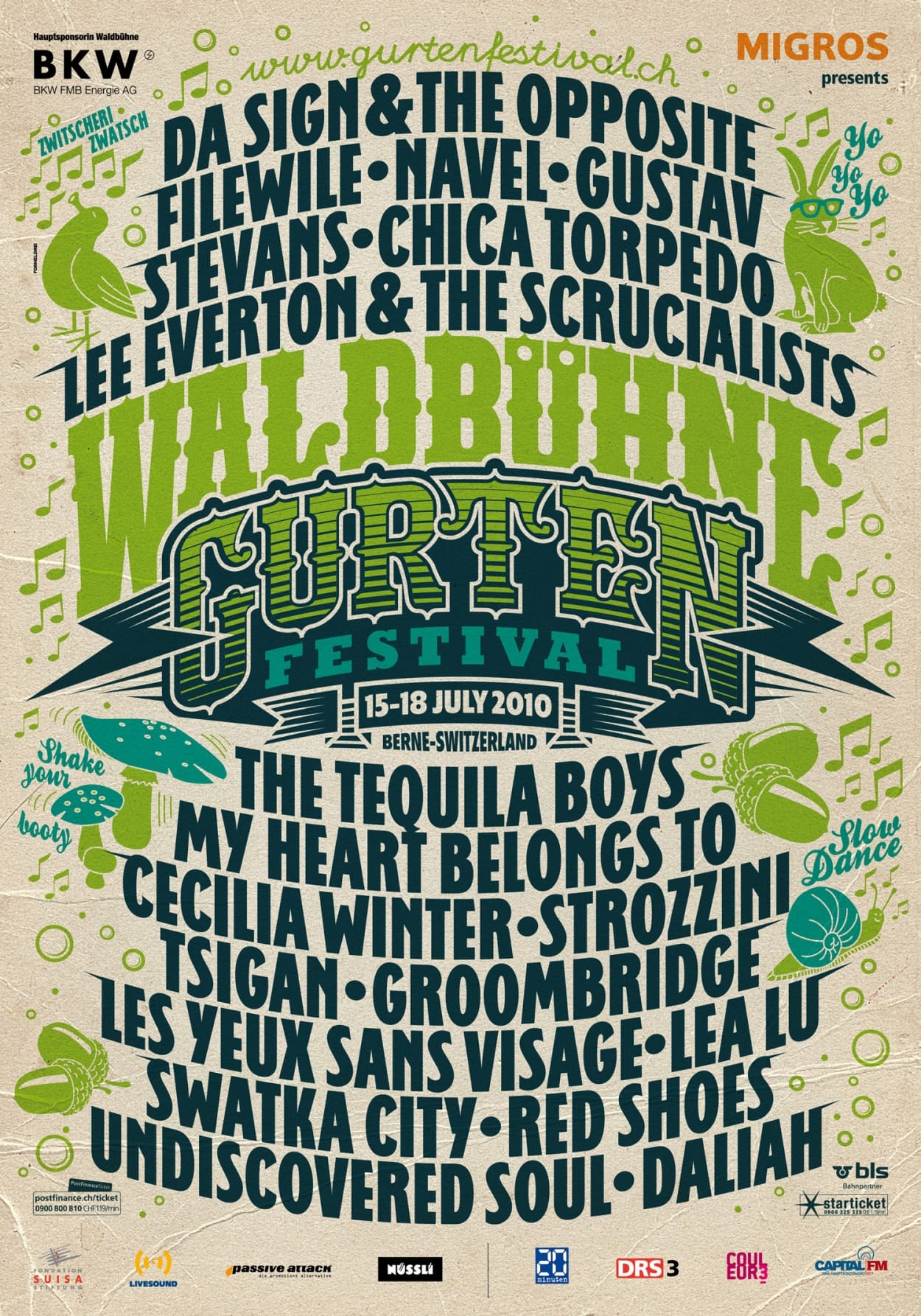 Auch die Visuals 2010 für die Programme von Haupt- und Waldbühne stammen aus unseren Ateliers. Babyshambles, Faith No More, The Kooks, Amy McDonald, Archive - die vielen Namen sprechen Bände. Und diese Top-Qualität will ansprechend inszeniert sein. Dieses Jahr kombiniert F3 einen guten Schuss Rock-Style mit einer Hand voll frischer Illustrationen und ein paar lustigen Streuseln zum grafischen Festival-Menü.