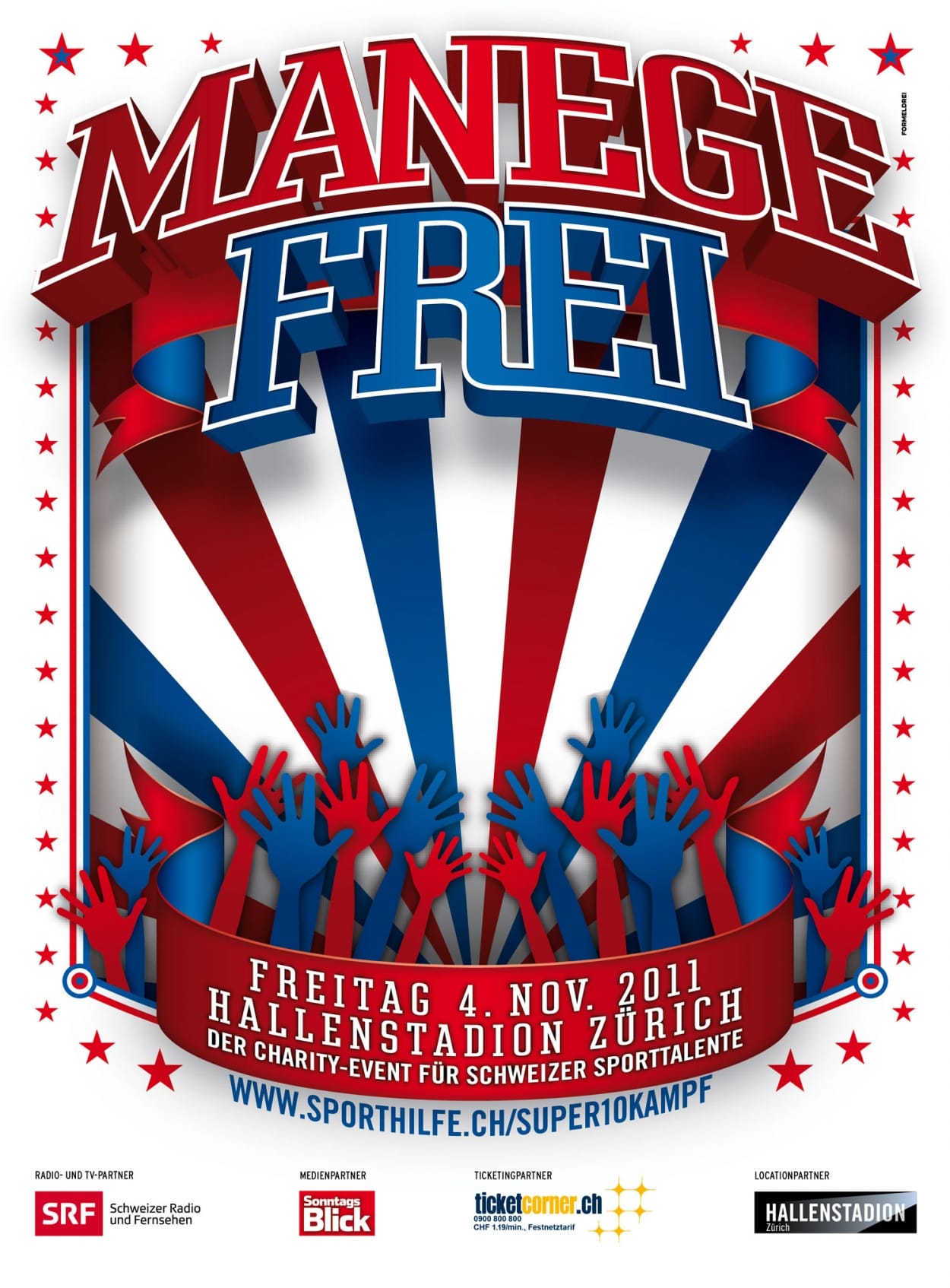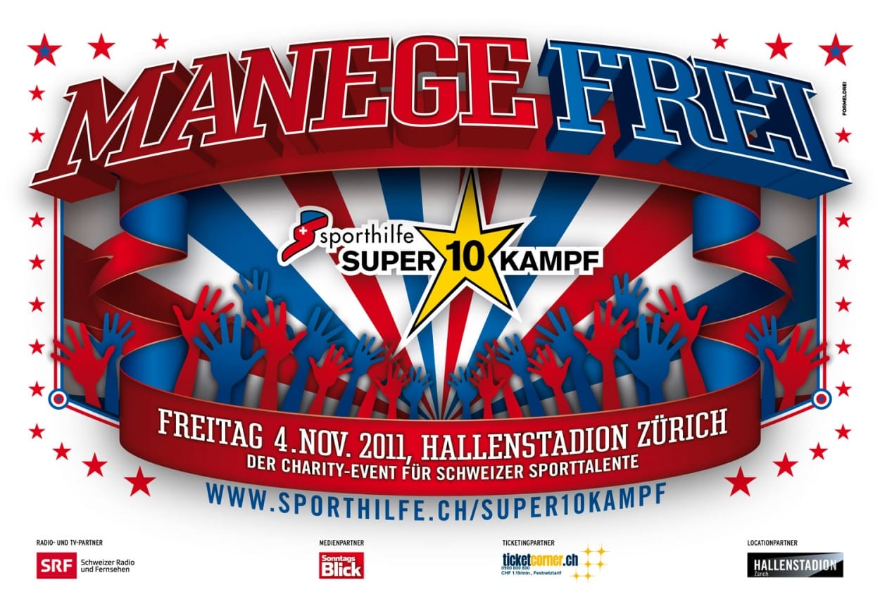 Spektakuläre Akrobatik, farbenprächtige Kostüme und witzige Showeinlagen: Der Super10Kampf verwandelt das Hallenstadion Zürich am Freitag, 4. November 2011, in eine riesige Zirkusarena. Unter dem Motto «Manege frei!» messen sich auch in diesem Jahr wieder Stars aus Sport und Showbusiness im „Circus Maximus“ in vielen lustigen und nicht ganz alltäglichen Spielen. Formeldrei inszeniert das Jahres-Highlight der Schweizer Sporthilfe ganz im Zirkus-Look. Realisiert wurden Inserate und verschiedenen Print-Massnahmen.