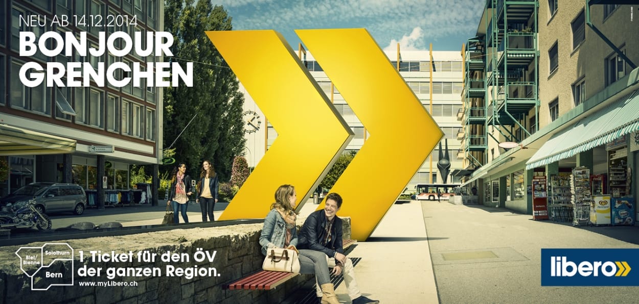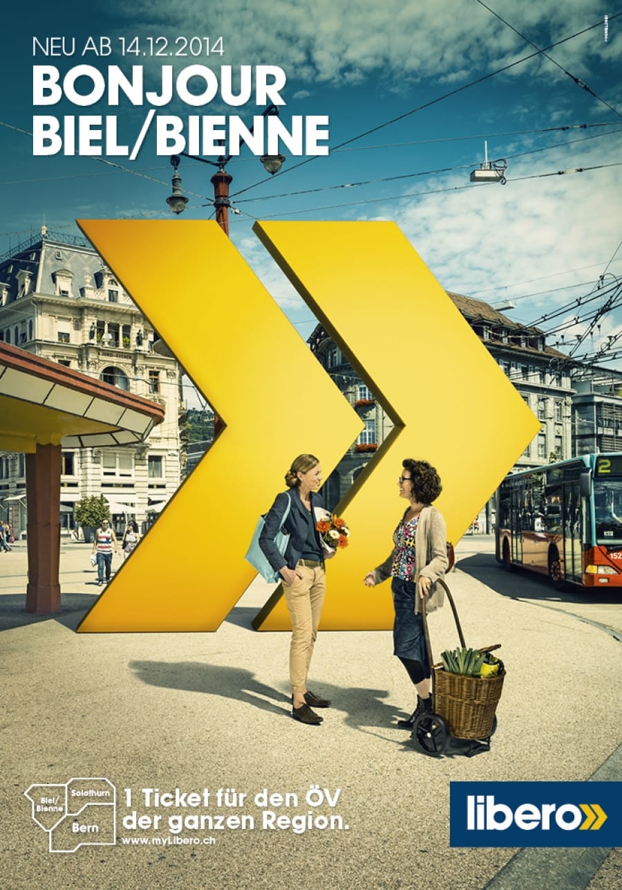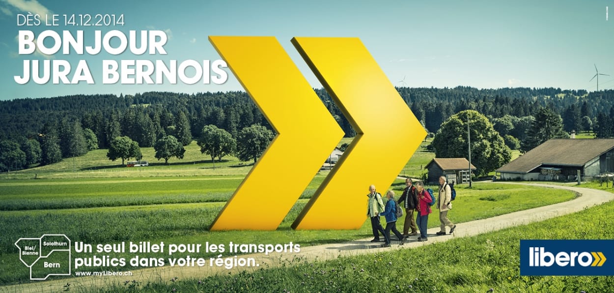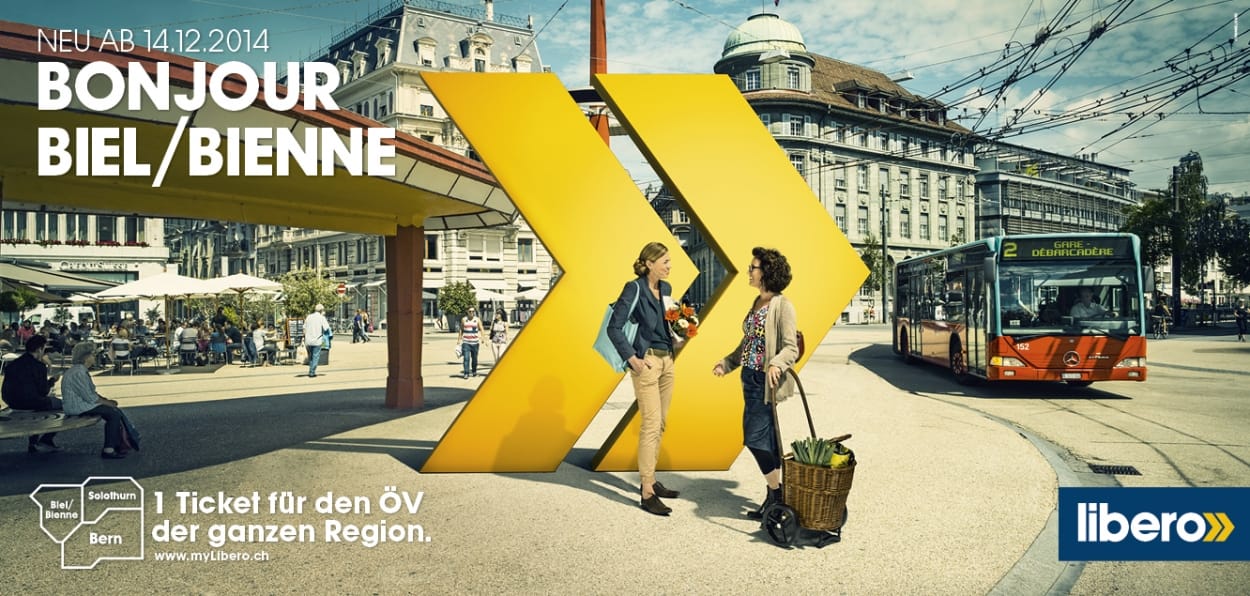 Biel, das Seeland, Grenchen und der Berner Jura stossen neu zum Libero-Tarifverbund, die ganze Region ist ab dem 14. Dezember 2014 mit einem einzigen Ticket für den ganzen Öffentlichen Verkehr unterwegs. Von der Gebietserweiterung profitieren aber auch die bestehenden Libero-Kunden: Direkt am Automaten lösen sie jetzt Fahrausweise für das Pendeln in Richtung Norden oder für spontane Ausflüge in die Wanderregion des Juras. Ab sofort kommuniziert der Libero zweisprachig. Konsequent stehen alle Informationen auf Deutsch und Französisch zur Verfügung – am Automaten, auf der Website, in allen Drucksachen und auch in der Werbung. Und wie "leger" der Libero die Sprachgrenze überwindet, beweist auch die Einführungskampagne. Die Plakate und Inserate, welche vornehmlich in den neuen Gebieten erscheinen, zeigen Städte- und Landschaftsbilder der Region und heissen zukünftigen Fahrgäste des Liberos mit einem freundlichen BONJOUR! herzlich willkommen. Zu allen Neuerungen des Libero-Tarifverbunds informiert ab dem 14.12.14 die rundum neu gestaltete und für Tablets Smartphones optimierte Website www.myLibero.ch.