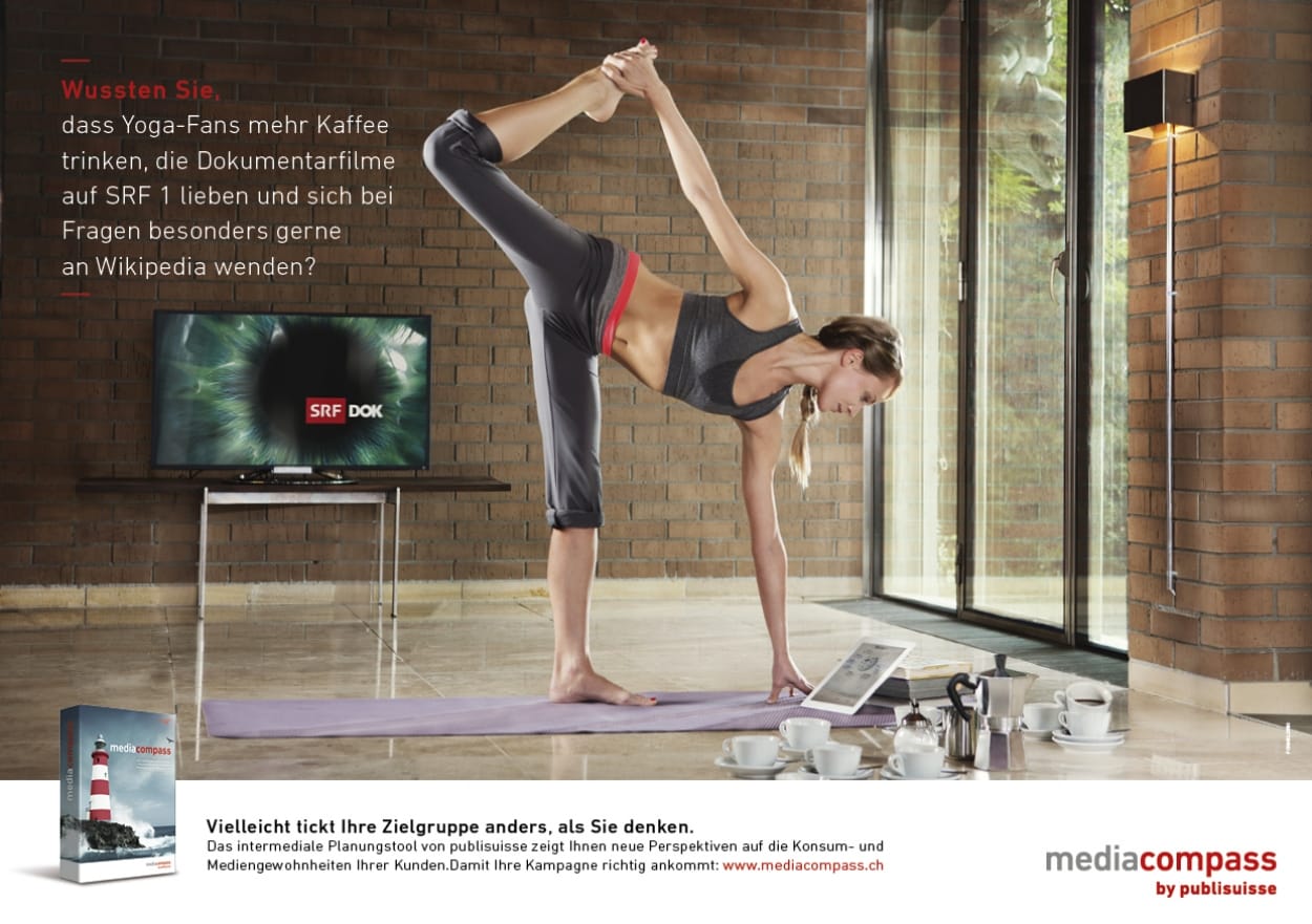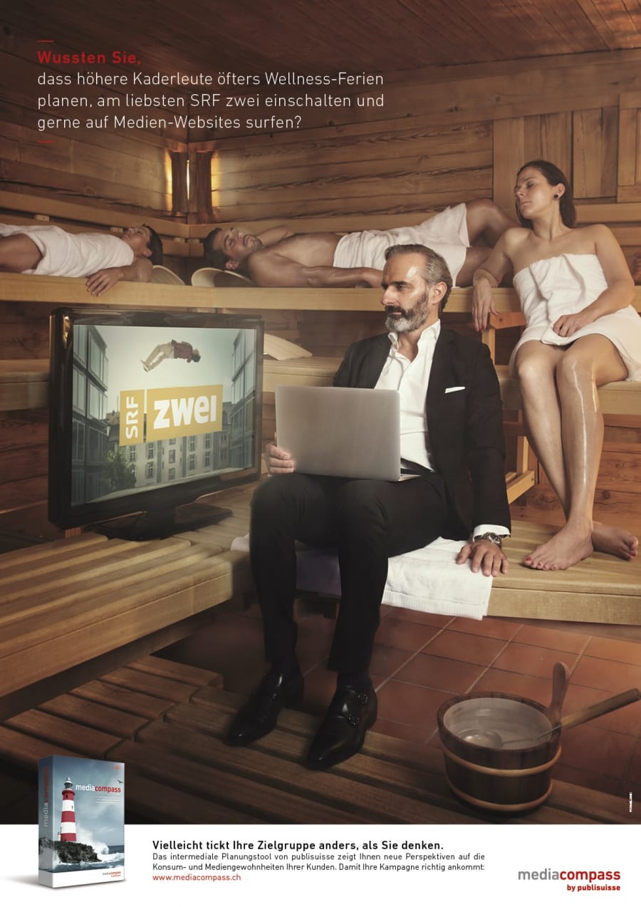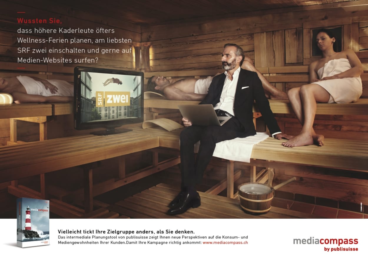 "Wussten Sie, dass höhere Kaderleute öfters Wellness-Ferien planen, am liebsten SRF 2 einschalten und gerne auf Medien-Websites surfen?", fragt eines der zwei neuen Sujets der Kampagne für den mediacompass von publisuisse und zeigt damit auf: Mit dem internetbasierten Intermedia-Tool für die strategische Medienplanung im Schweizer Markt gewinnen Kampagnenstrategen neue Erkenntnisse und wertvolle Einblicke in die Konsum- und Mediengewohnheiten der potenziellen Kundschaft. Die von publisuisse ausgearbeitete Idee wurde durch Formeldrei umgesetzt und zeigt die unerwartet unterschiedlichen Vorlieben und Wünsche der Zielgruppenvertreter auf ein und demselben Bild. Realisiert werden Anzeigen in der Wirtschafts- und Kommunikationsfachpresse und Online-Banners sowie der Auftritt auf der Homepage http://www.mediacompass.ch.