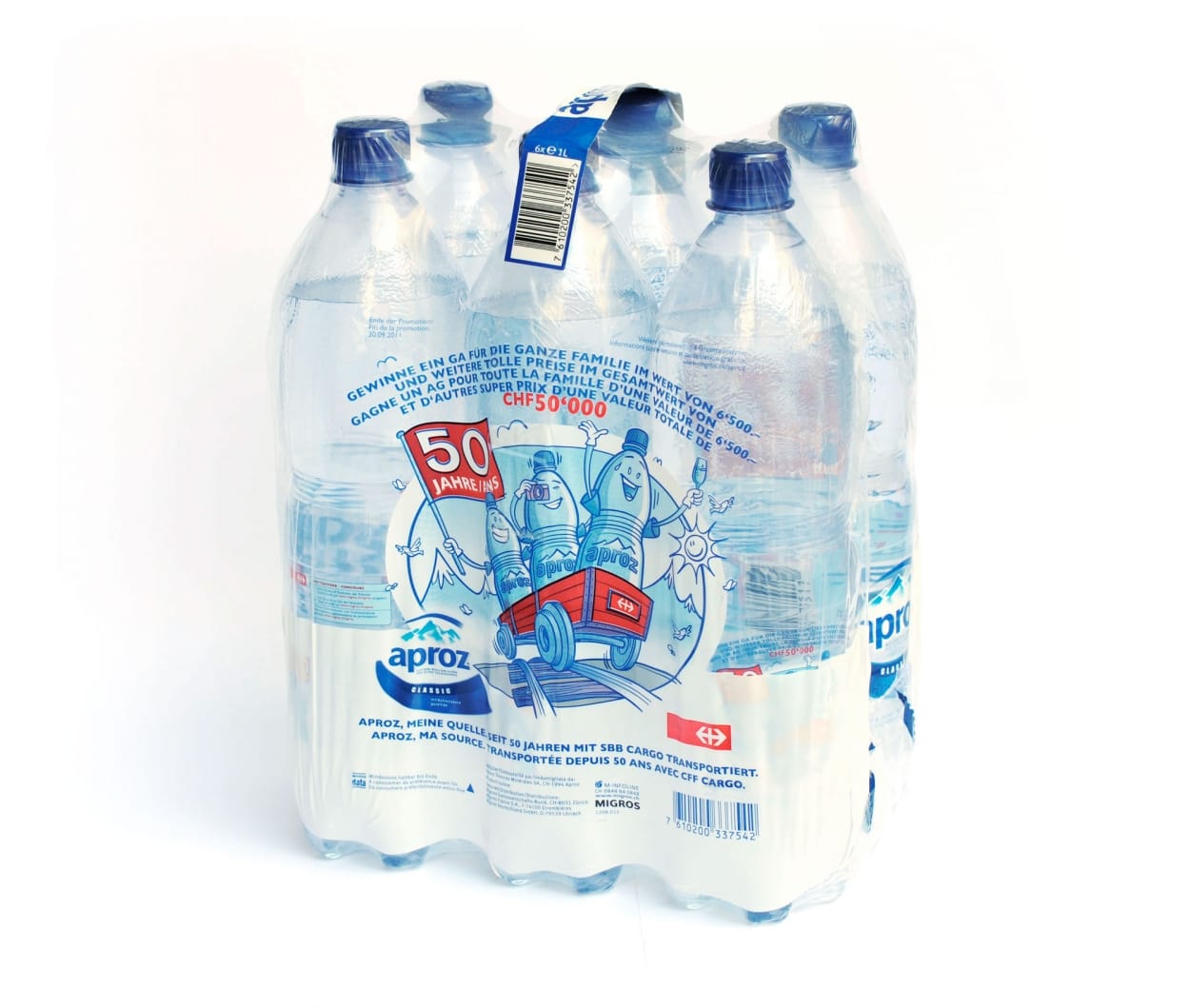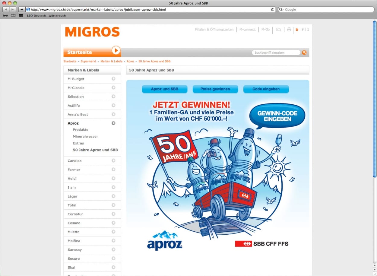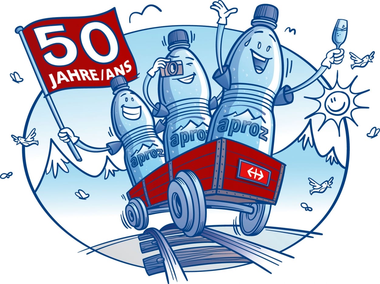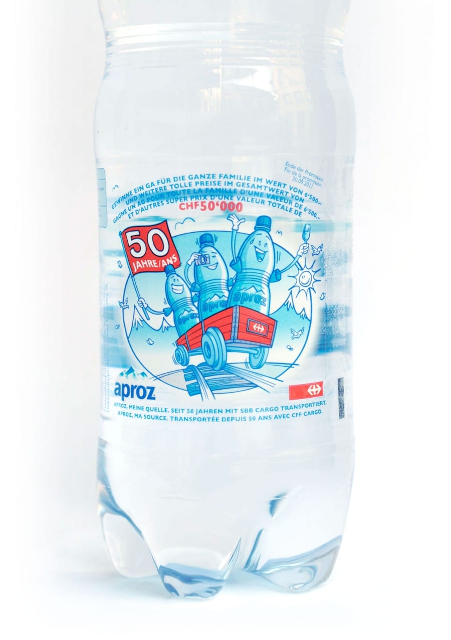 Aproz feiert dieses Jahr ein besonderes Jubiläum: Seit stolzen 50 Jahren transportiert das Migros-Unternehmen sein Mineralwasser aus den Quellen der Walliser Alpen mit SBB Cargo. Zu diesem Anlass hat Formeldrei eine Konsumentenpromotion entwickelt und umgesetzt. Auf allen Aproz-Verpackungen sind während diesem Sommer Codes aufgedruckt, mit welchen auf der Aproz-Website täglich Preise gewonnen werden können.