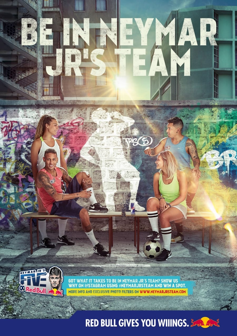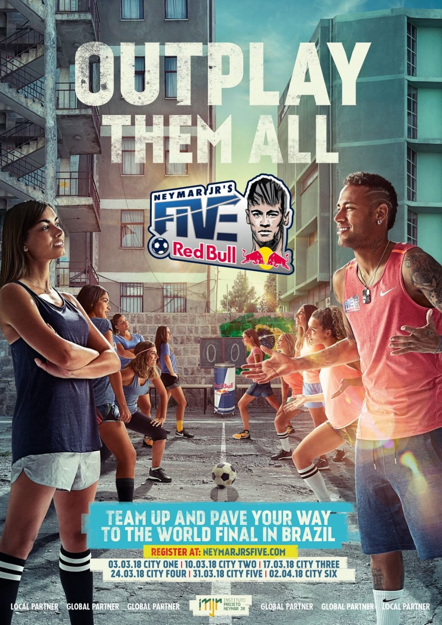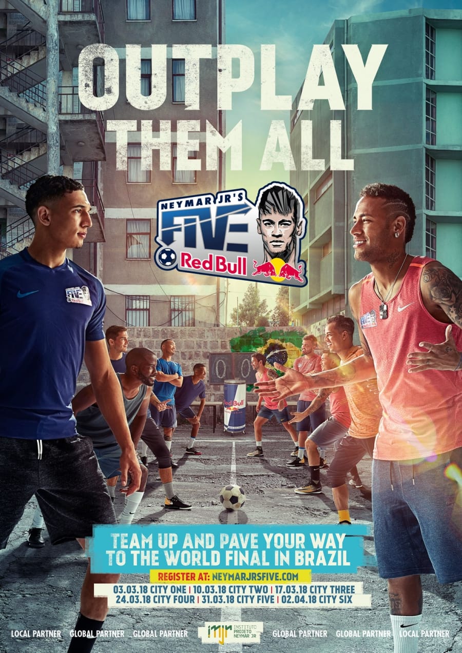 Weit mehr als 50 Länder, 17.000 Teams und 104.000 Spieler waren es 2017. Und nächstes Jahr wird das weltweite Turnier von Red Bull noch grösser. Neymar Jr’s Five hat in der Fussball-Welt für Aufregung gesorgt und sich als Event der Spitzenklasse etabliert. Schnelligkeit, Technik und Präzision, 5 gegen 5, kleine Plätze, kleine Tore, jedes Tor führt beim Gegner zum Verlust eines Spielers. Nach Quali-Runden auf sechs Kontinenten kämpfen die Winner aus über 60 Ländern beim Finale im Instituto Projeto Neymar Jr in Brasilien um den Titel des Neymar Jr's Five World Champions und spielen anschließend in einem Prestige-Match gegen Neymar Jr und vier seiner Freunde. Boys und Girls können sich als Teams anmelden, aber nur eines kann gewinnen.