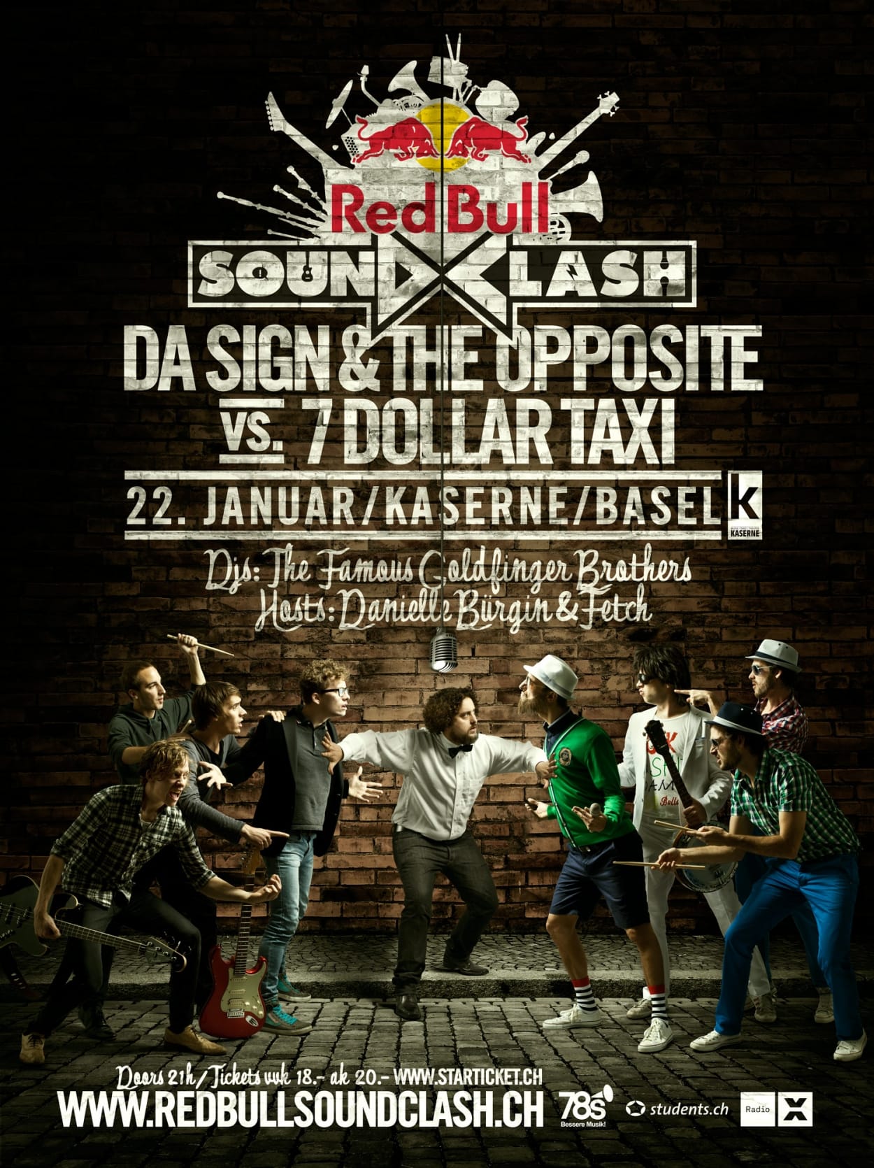 Beim Red Bull Soundclash, dem musikalischen Duell über alle Genre-Grenzen hinweg, stehen sich die Berner DA SIGN & THE OPPOSITE und 7 DOLLAR TAXI aus Luzern gegenüber. Vier Runden dauert der Kampf, der sicher niemanden umbringt, aber die Konzertbesucher ziemlich sicher umhaut. Wer holt den begehrten Titel? Das Publikum entscheidet…