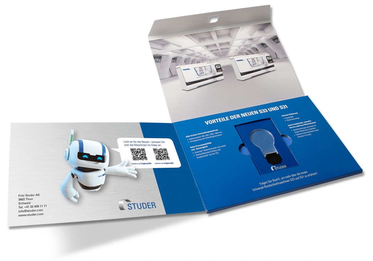 Dass Schleifmaschinen durchaus eine gewisse Sexyness versprühen können, demonstriert die Studer AG schon seit längerer Zeit. Formeldrei rückt im neusten Mailing die modernisierten S33- und S31-Schleifer ins richtige Licht: Wer die Karte aufklappt, findet ein Lämplein im Kreditkartenformat – und kann den Schalter gleich selber umdrehen. Die Filme zu den Maschinen wurden erneut von Thomas Stocker Efex.ch in grandiosen, modernen und effektvollen Movies umgesetzt.